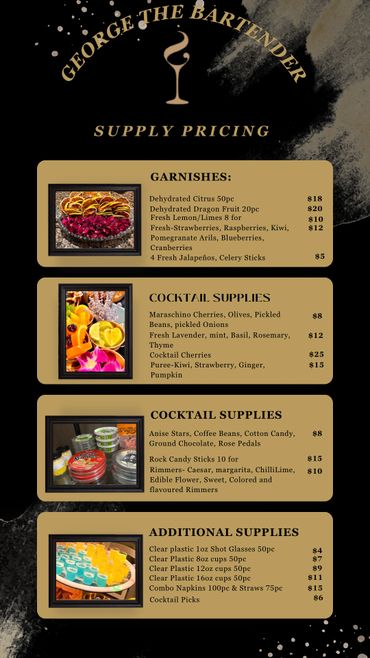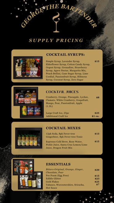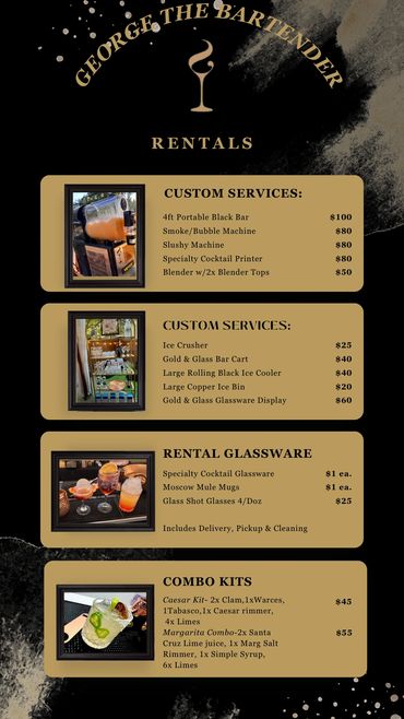 Premium Rentals: Beyond bartending, George provides high-quality rental kits, including craft syrups, glassware, and specialty add-ons like gold flakes and edible glitter.