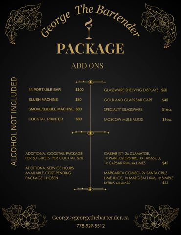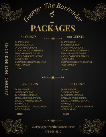 At George The Bartender, we specialize in elevating events with signature cocktails, professional bartending, and premium rentals. Based in the Lower Mainland, we bring passion, expertise, and creativity to every celebration, ensuring your guests enjoy a seamless and unforgettable experience. Let us handle the drinks while you savor the moment!